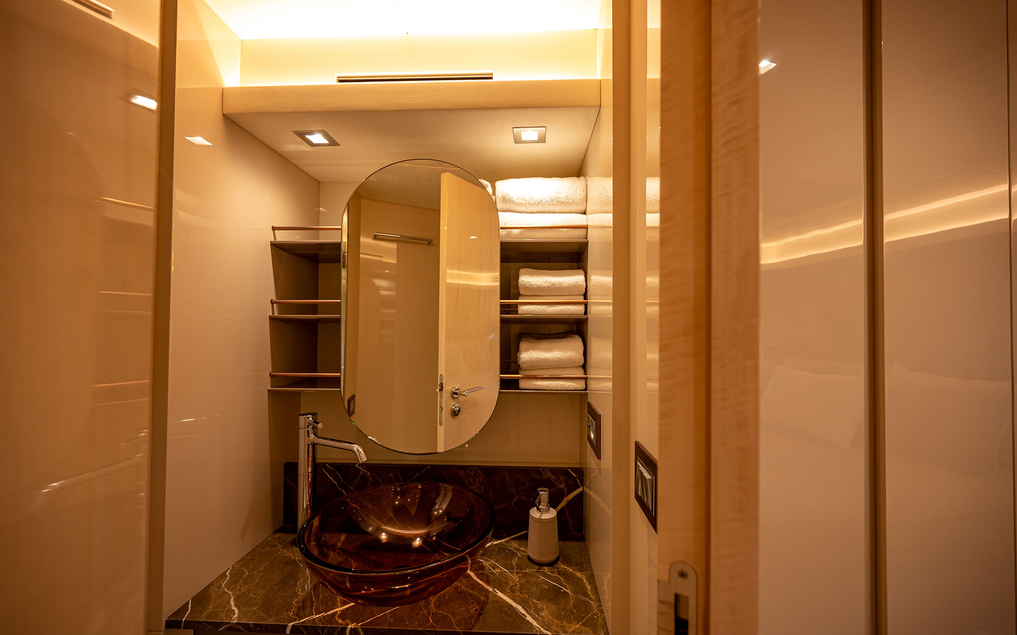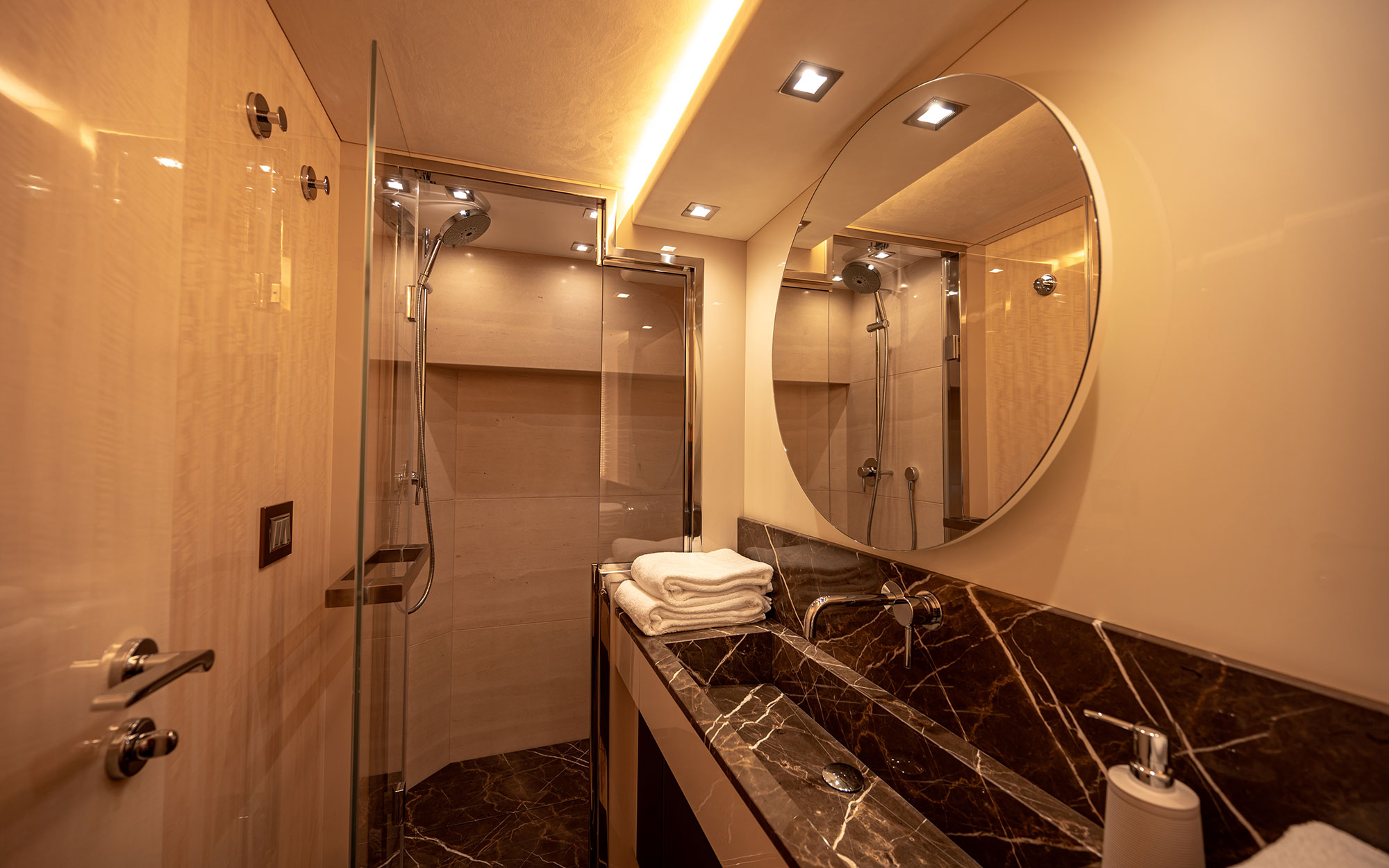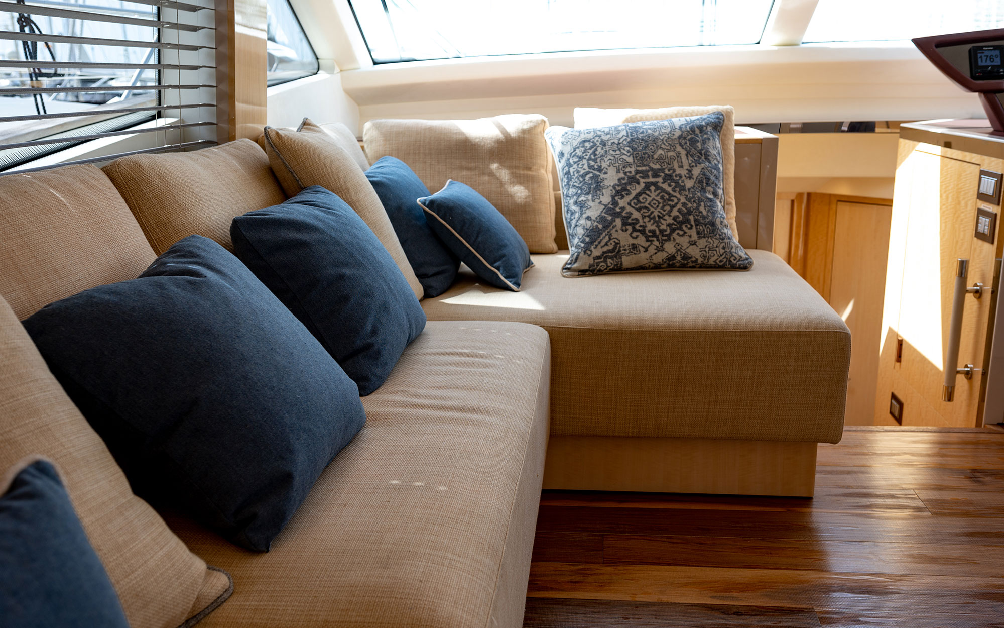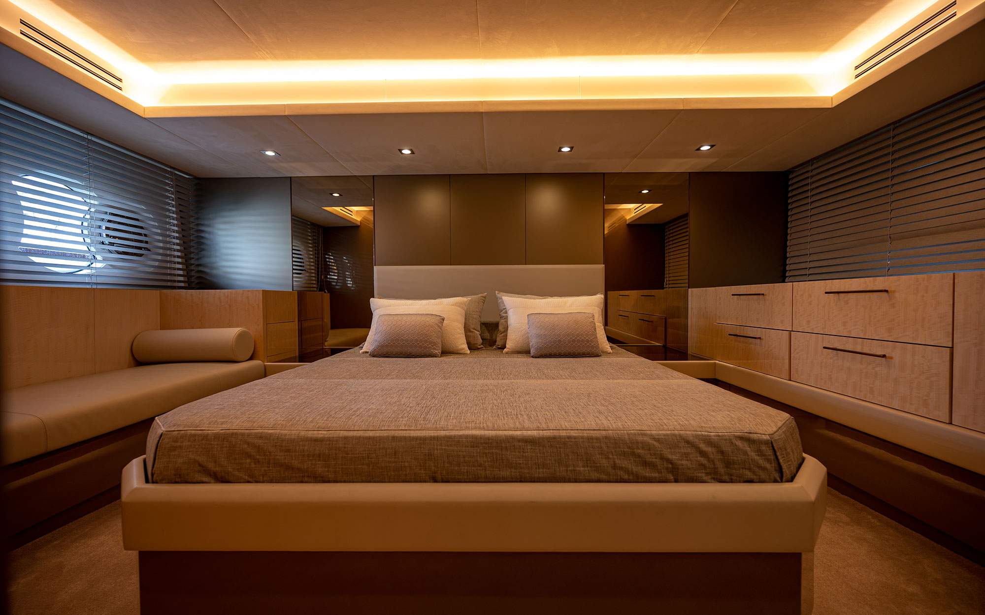 She runs a comfortable 24-knot cruise and reaches 30 knots when needed. The MAN V8s are straightforward to maintain, and with joystick, bow and stern thrusters, handling in marinas is genuinely easy, even with limited crew.
