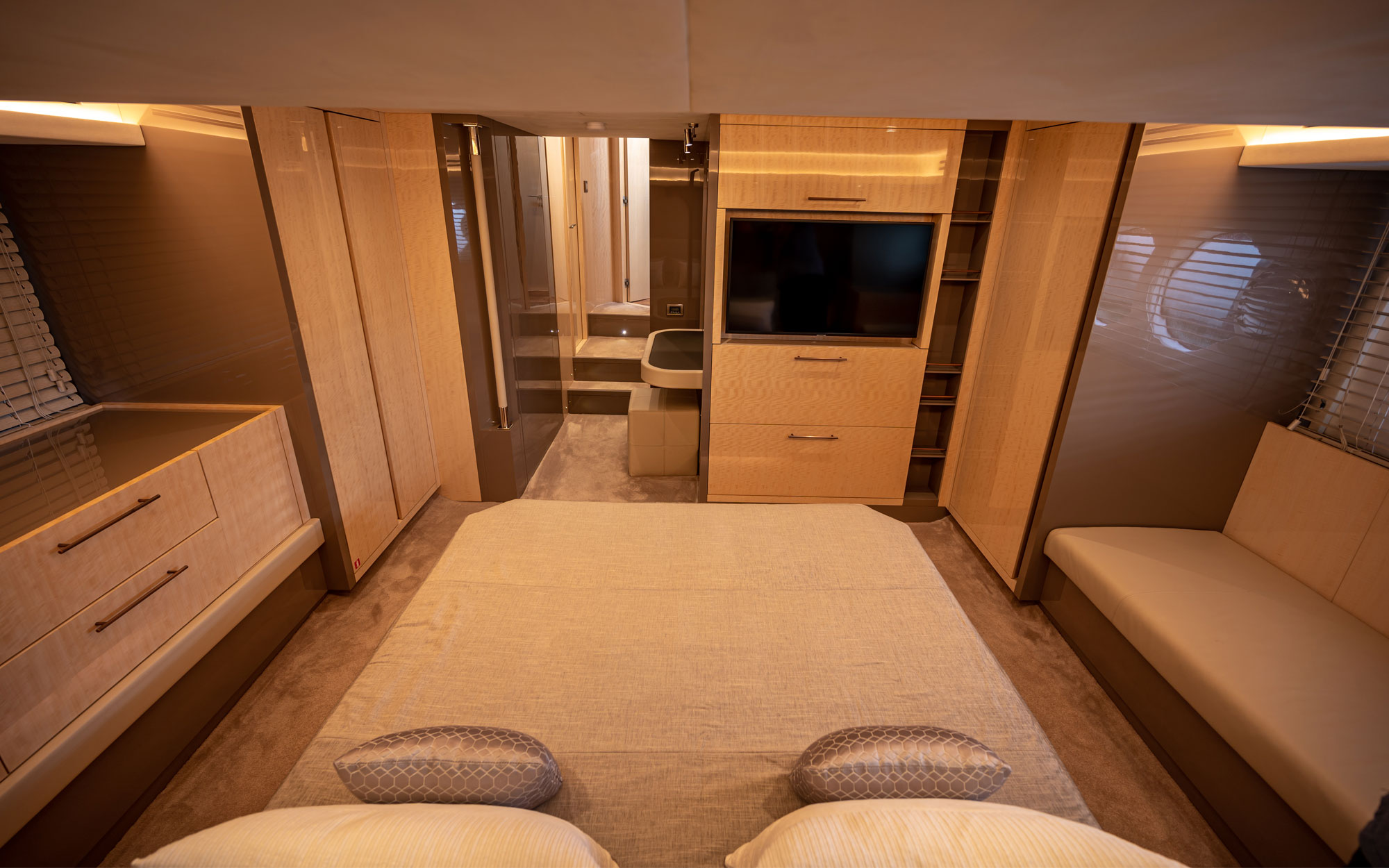 On deck, the flybridge is a strong feature – carbon-fibre hardtop with an opening section, good seating and sunbathing areas, and a second helm. A hydraulic swim platform, Seakeeper stabiliser, upgraded Raymarine electronics, watermaker, and full domestic appliances complete the spec.